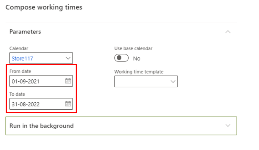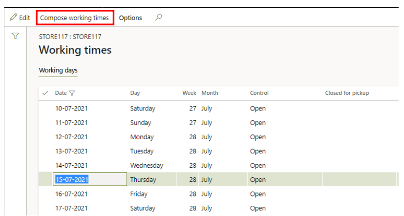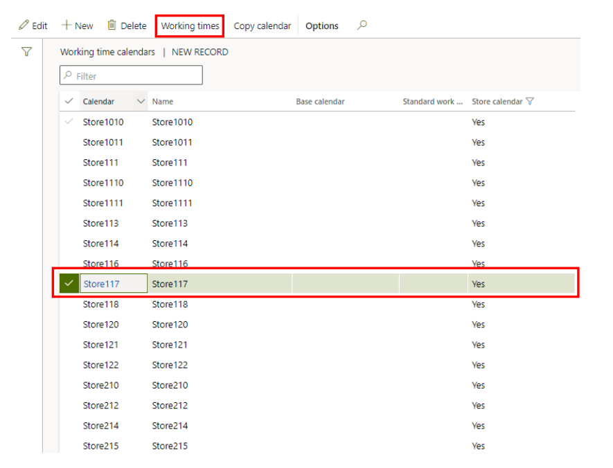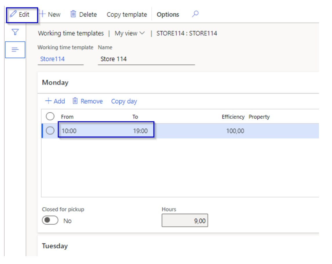 Go to ‘Working time calendars’. Mark your store and click ‘Working times’