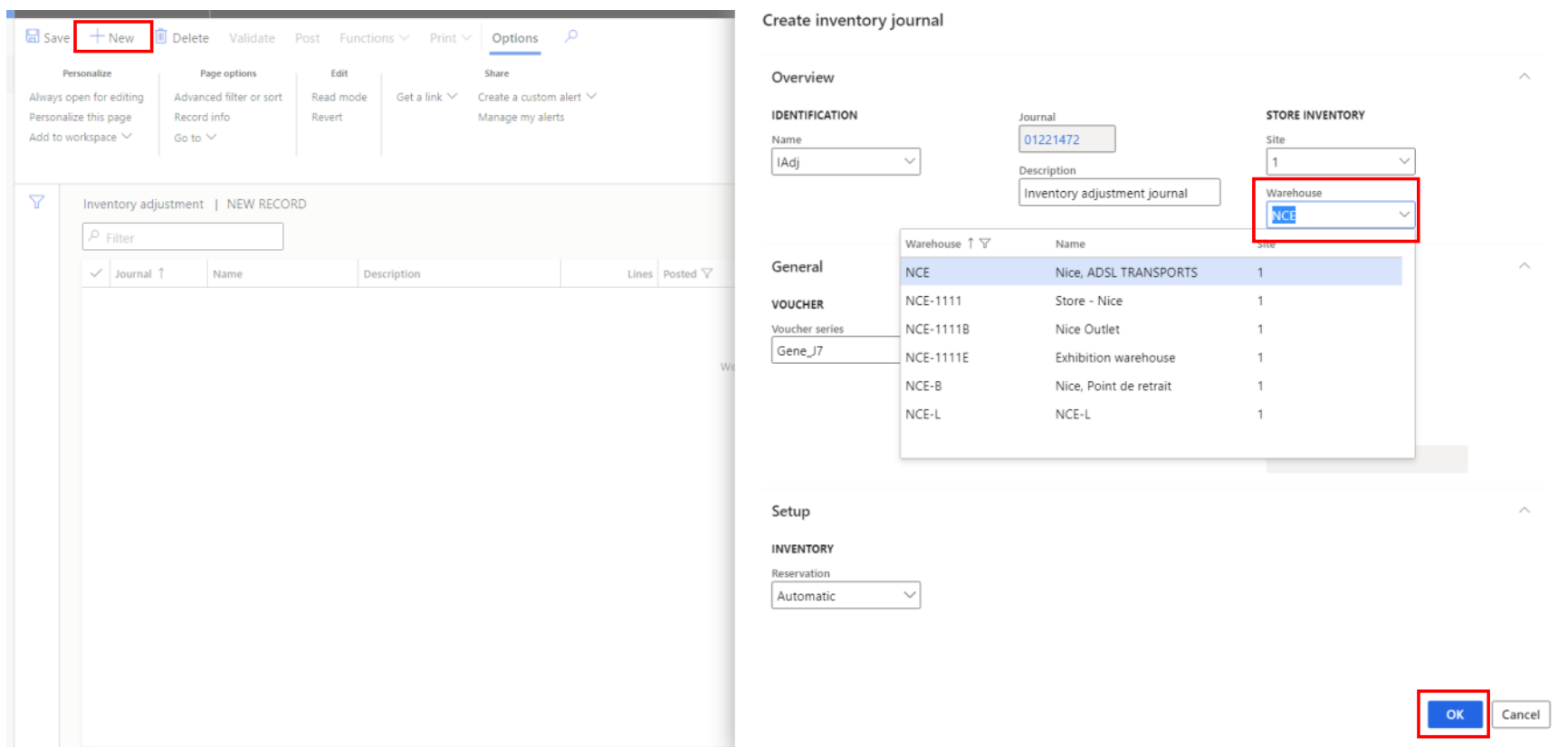 Go to ‘Inventory Adjustment’ and press “New” to create a new journal. Then, fill the warehouse where you