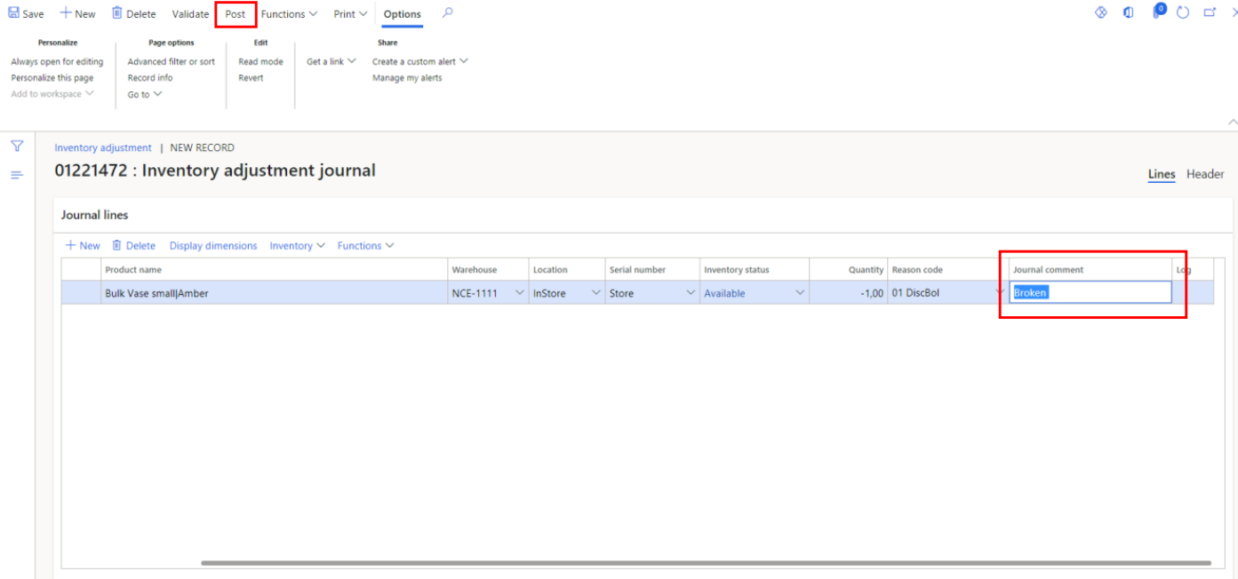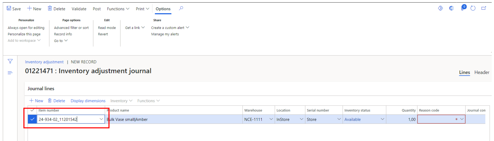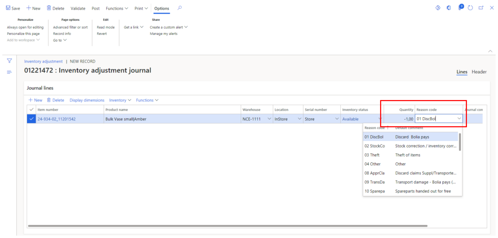 In journal lines section, press “New” to create a new line and fill in the item number you want to win / lose. In this example picture, Bulk Vase Small Amber.