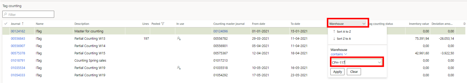 Find all your stores countings by filtering for your warehouse in ‘Tag counting’