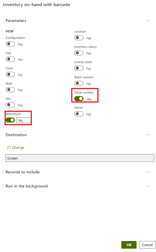 Make sure the ‘Serial number’ and ‘Warehouse’ is on ‘Yes’ and click ‘OK’.