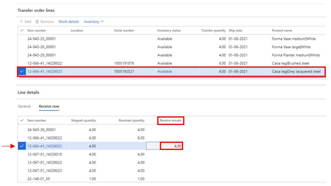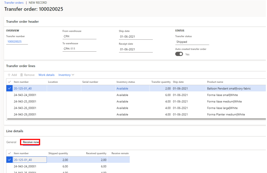 Open your transfer order and click ‘Receive now’