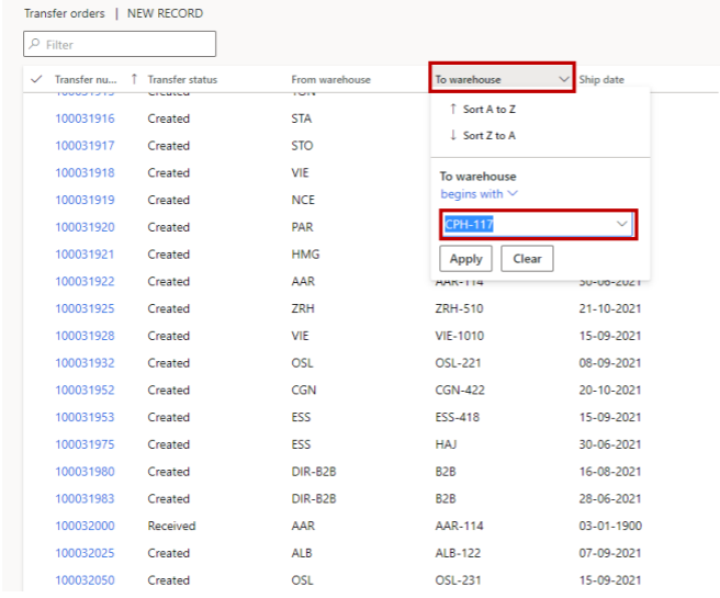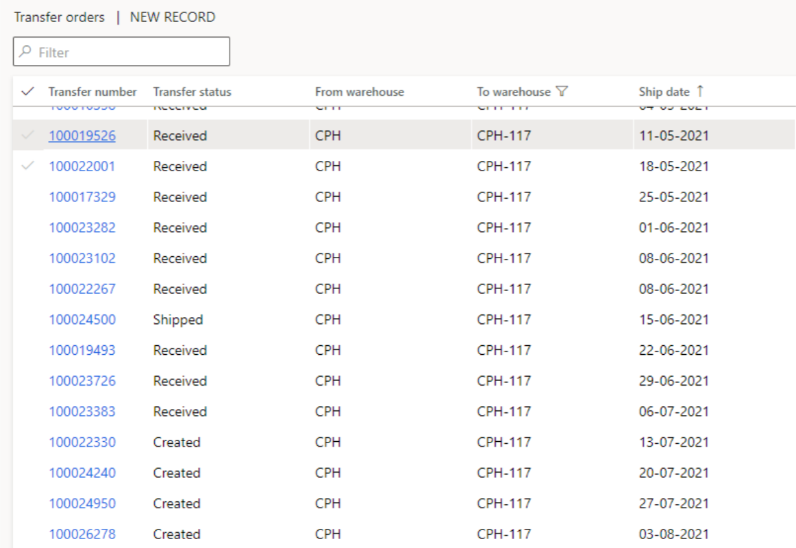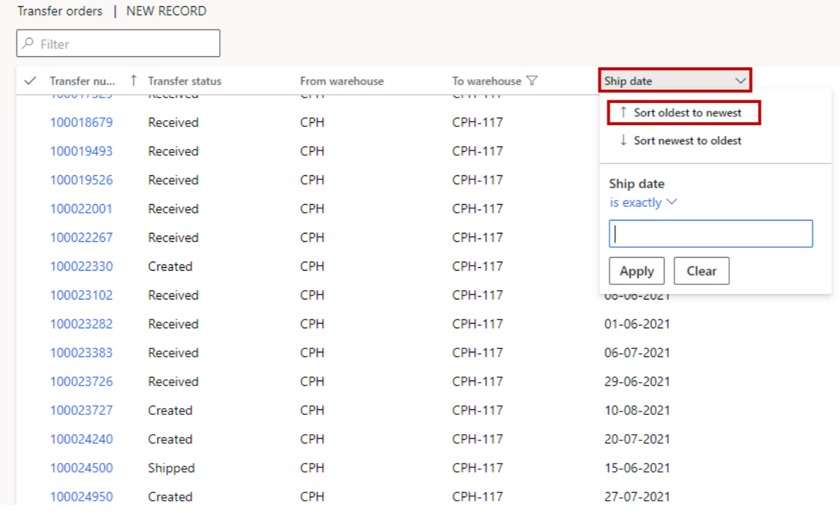 To see the transfer orders chronologically go to ‘Ship date’ and choose ‘Sort oldest to newest’