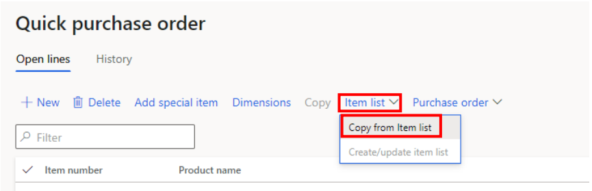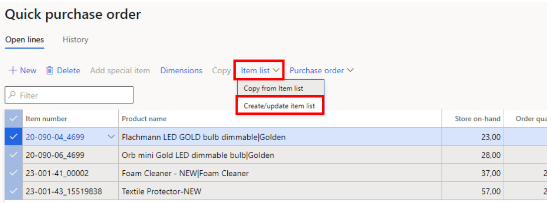 Go to ‘Quick purchase order’. Click ‘Item list’ and choose ‘Copy from item list’
