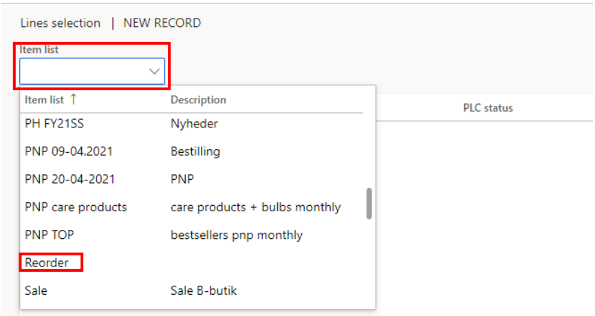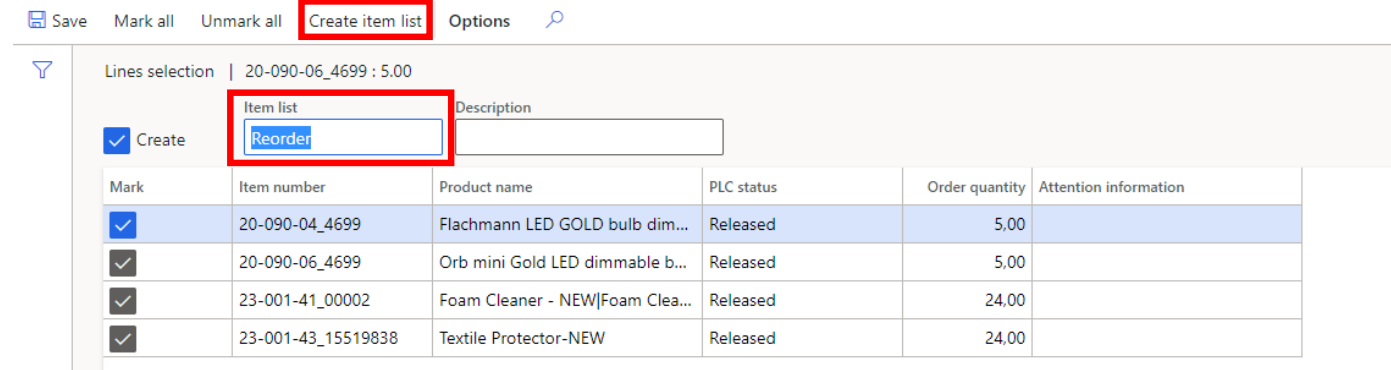Mark all items and click on ‘Item list’. Now choose ‘Create/update item list’