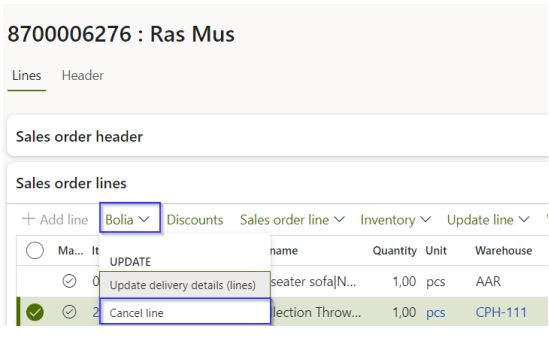Cancel line by clicking on 'Bolia' and then 'Cancel line'