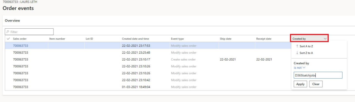 To get a better view click on ‘Created by’ and filter it to ‘is not’. Write in ‘D365batchjobs’ and click ‘Apply’