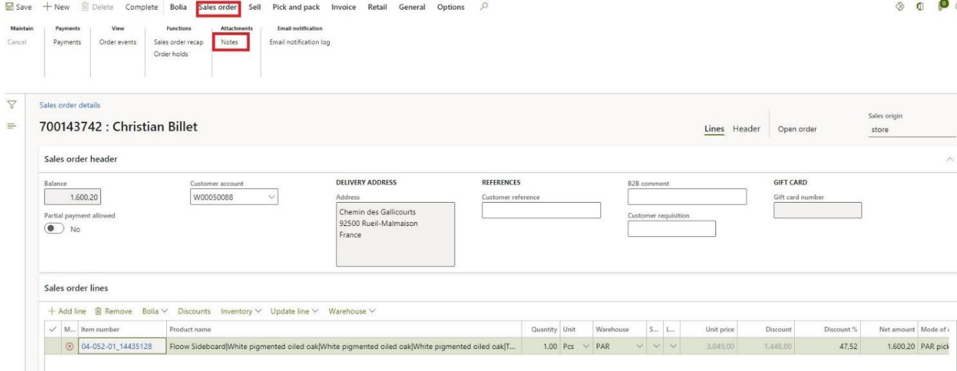 The note function is the best way to leave important information concerning the sales order and to