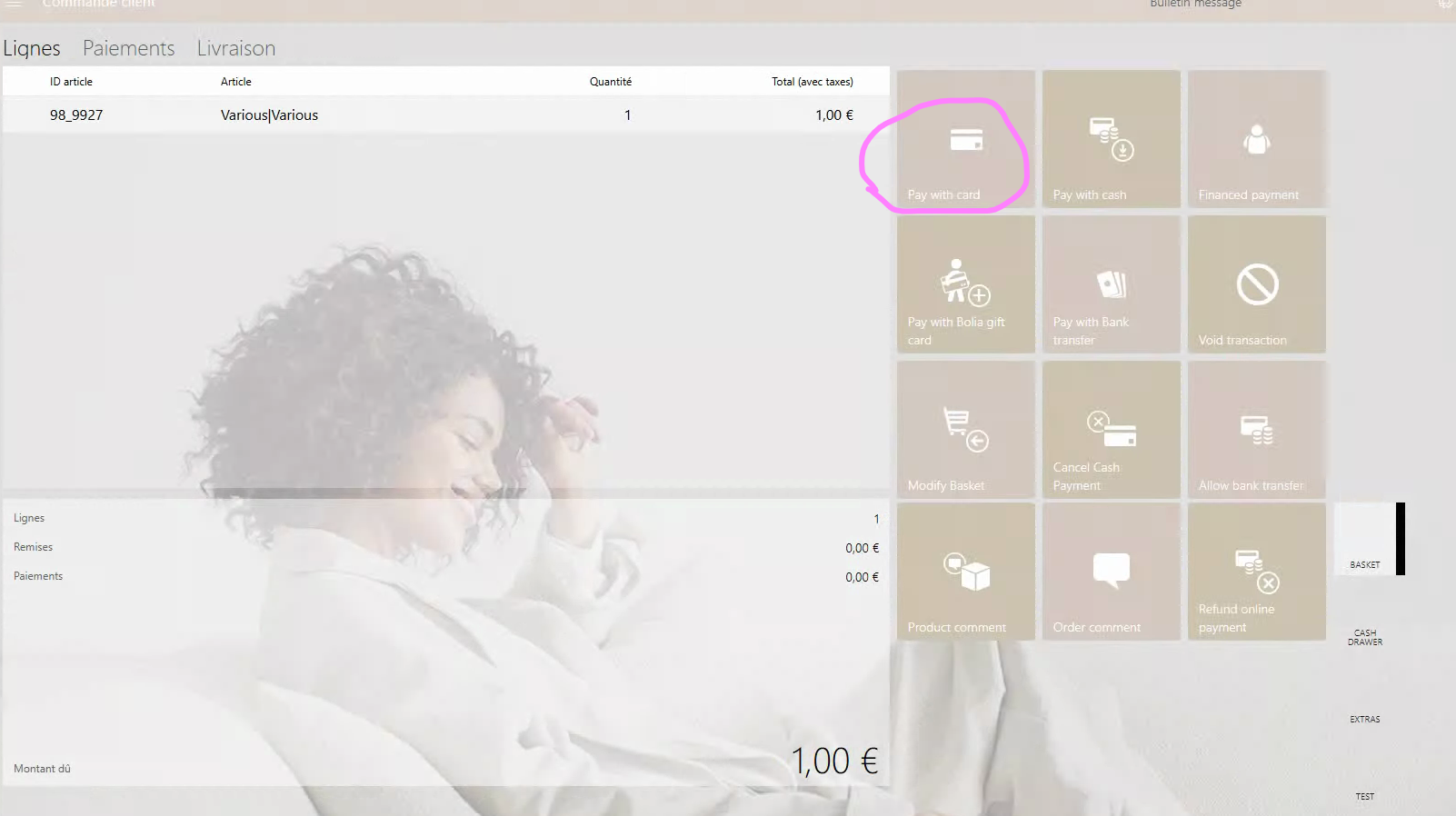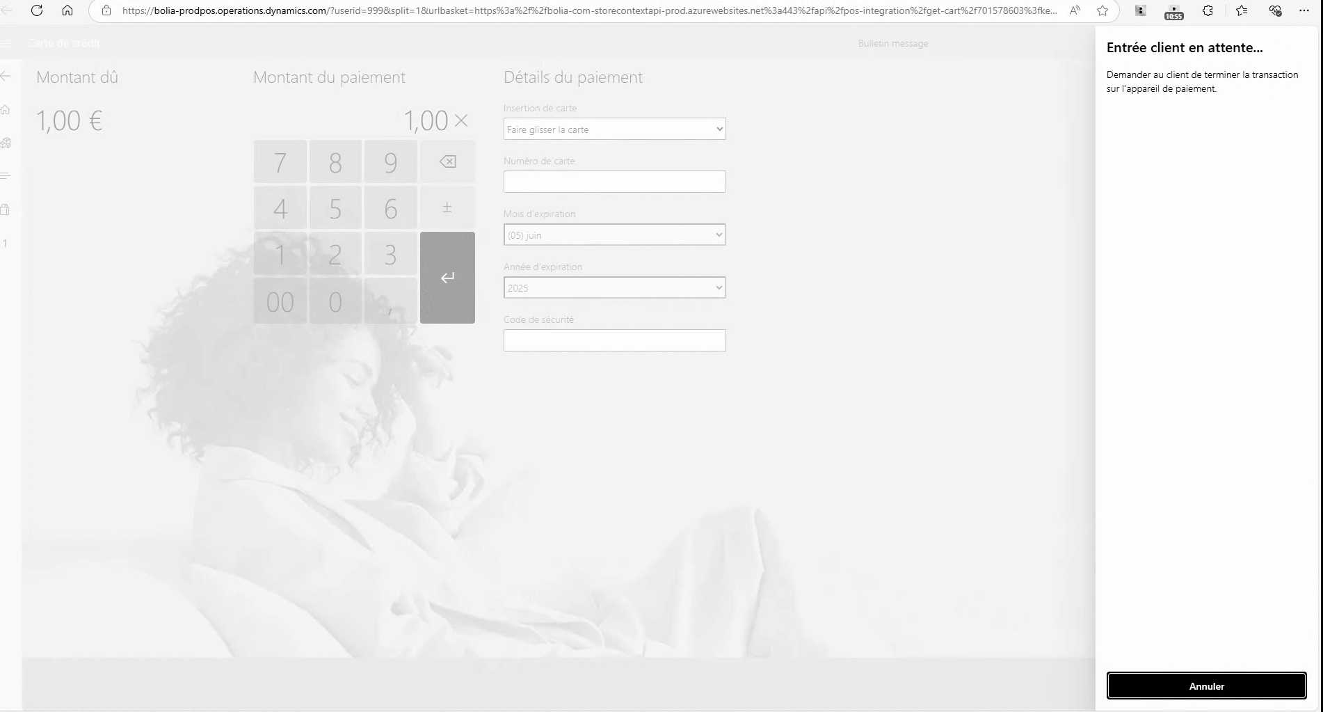 3. Click enter. If it is working it should look like on the picture below, and the price should be visible and ready to pay on the terminal. You do not need to go through with an actual payment. Click on the red button on the terminal to cancel the payment.