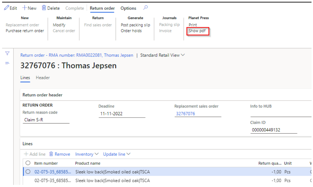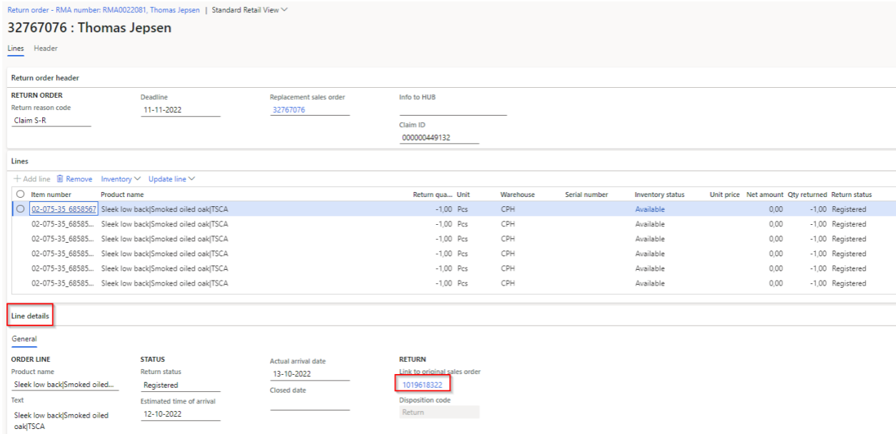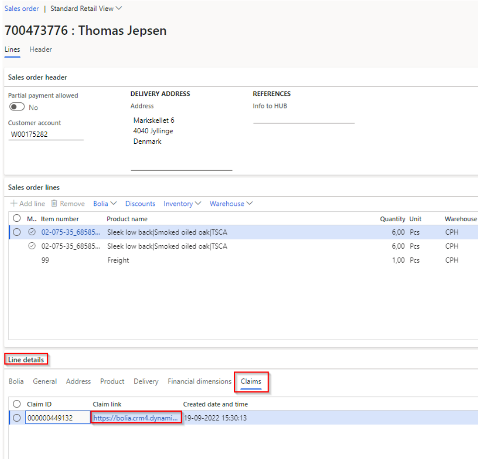 You are now in the original sales order. Scroll down to line details and click on ‘Claim’.