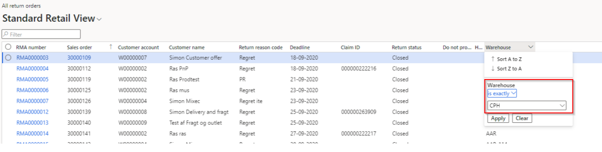 Filter for your HUB Warehouse. Remember to put in ‘Is exactly’